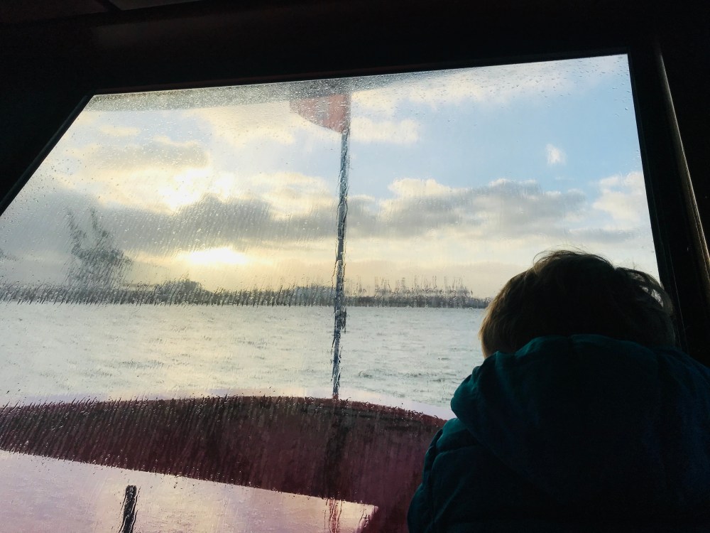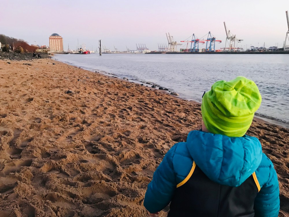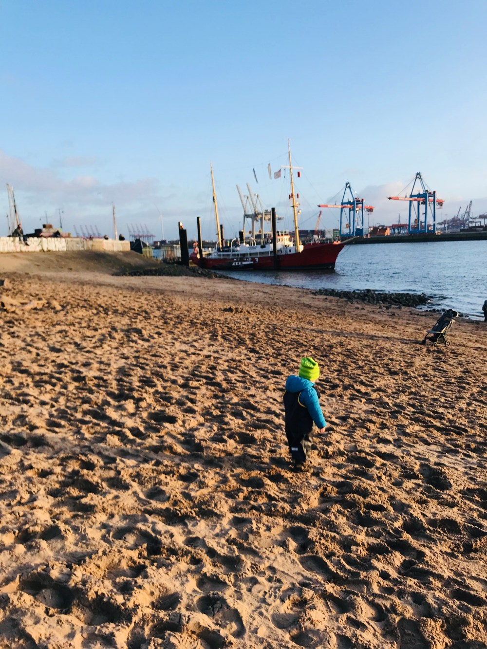 In Hamburg selbst gibt es tausend Möglichkeiten für Kinder (die wir so nicht in Koblenz haben): von Kindermuseen, Kindercafes, Kinderschwimmbädern etc. Uns zog es aber an den Strand. Den fuhren wird standesgemäß (und günstig, da im Tagesticket der Hamburger Verkehrsbetriebe enthalten) mit Schiff an. Die HVV Linie / Fähre 62 müsst ihr nehmen. Das Schiff fährt z.B. An den Landungsbrücken ab, nah von der Hafencity, über Altona Fischmarkt und dann Ausstieg Neumühlen Anleger Museumshafen Oevelgönne. Eine richtig spannende Anreise, auch für Pepe und seine Freunde.