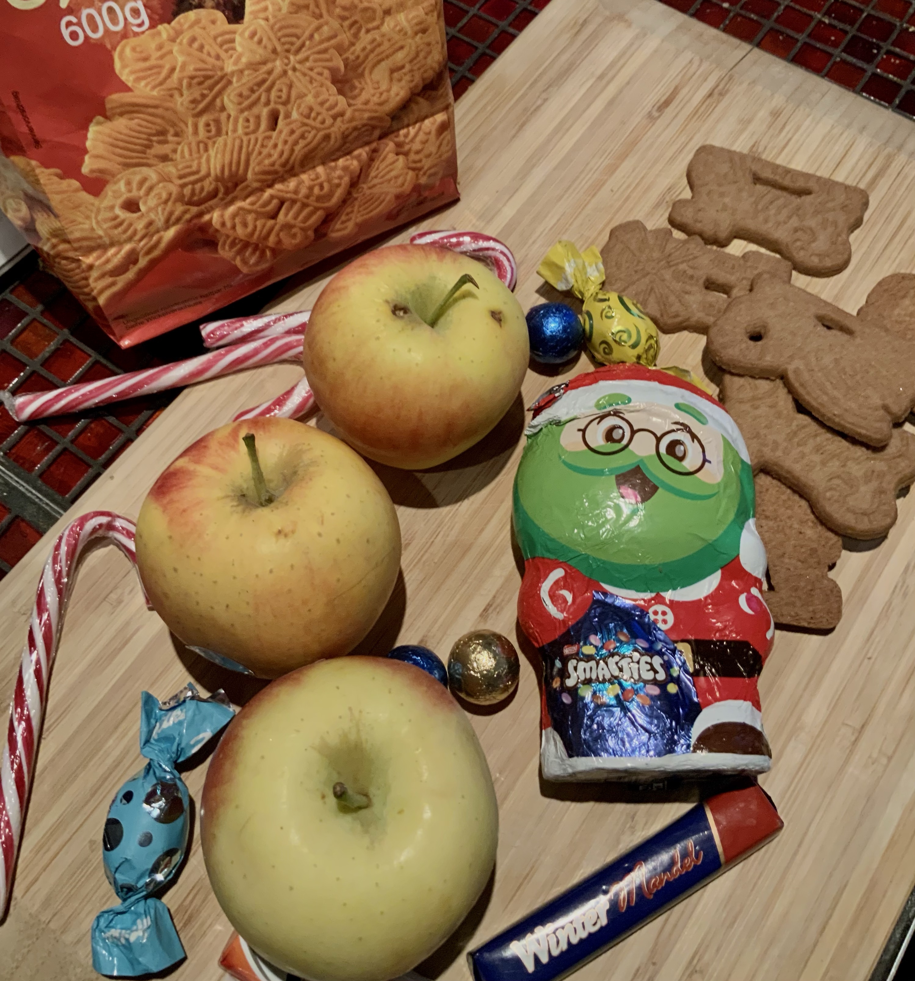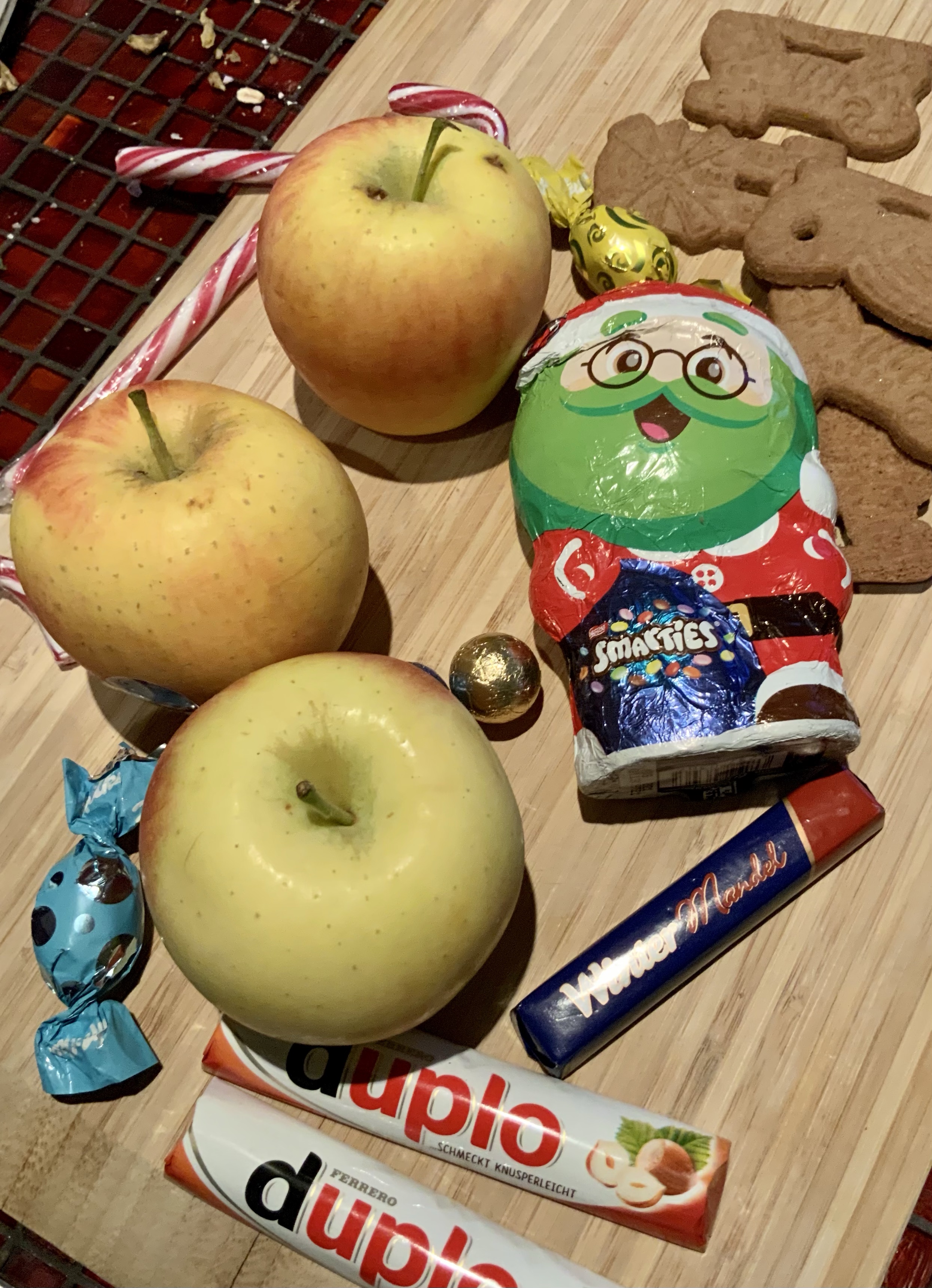 - Weihnachtssüßigkeiten: z.B. Schokolade, Spekulatius, Mandeln.