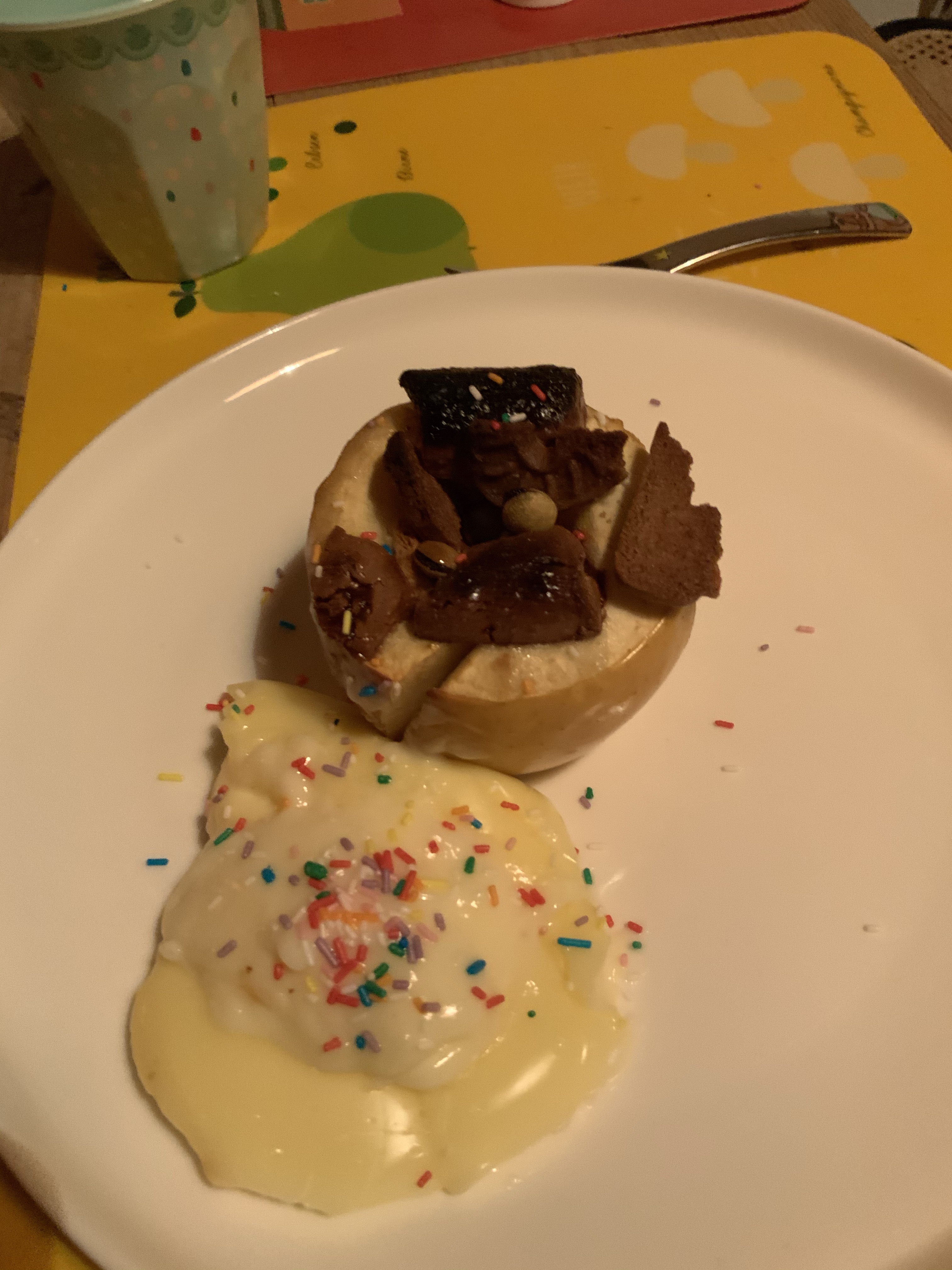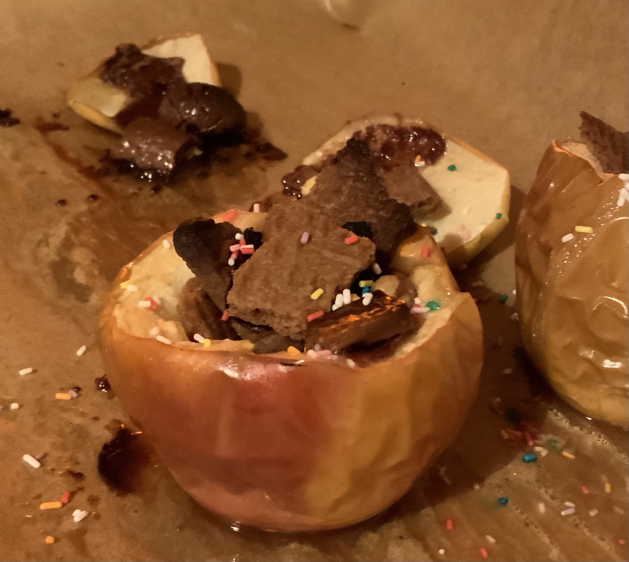 2. Eure übrig gebliebenen Weihnachtssüßigkeiten klein zerbröseln. Bißchen naschen ist erlaubt. In die Äpfel füllen