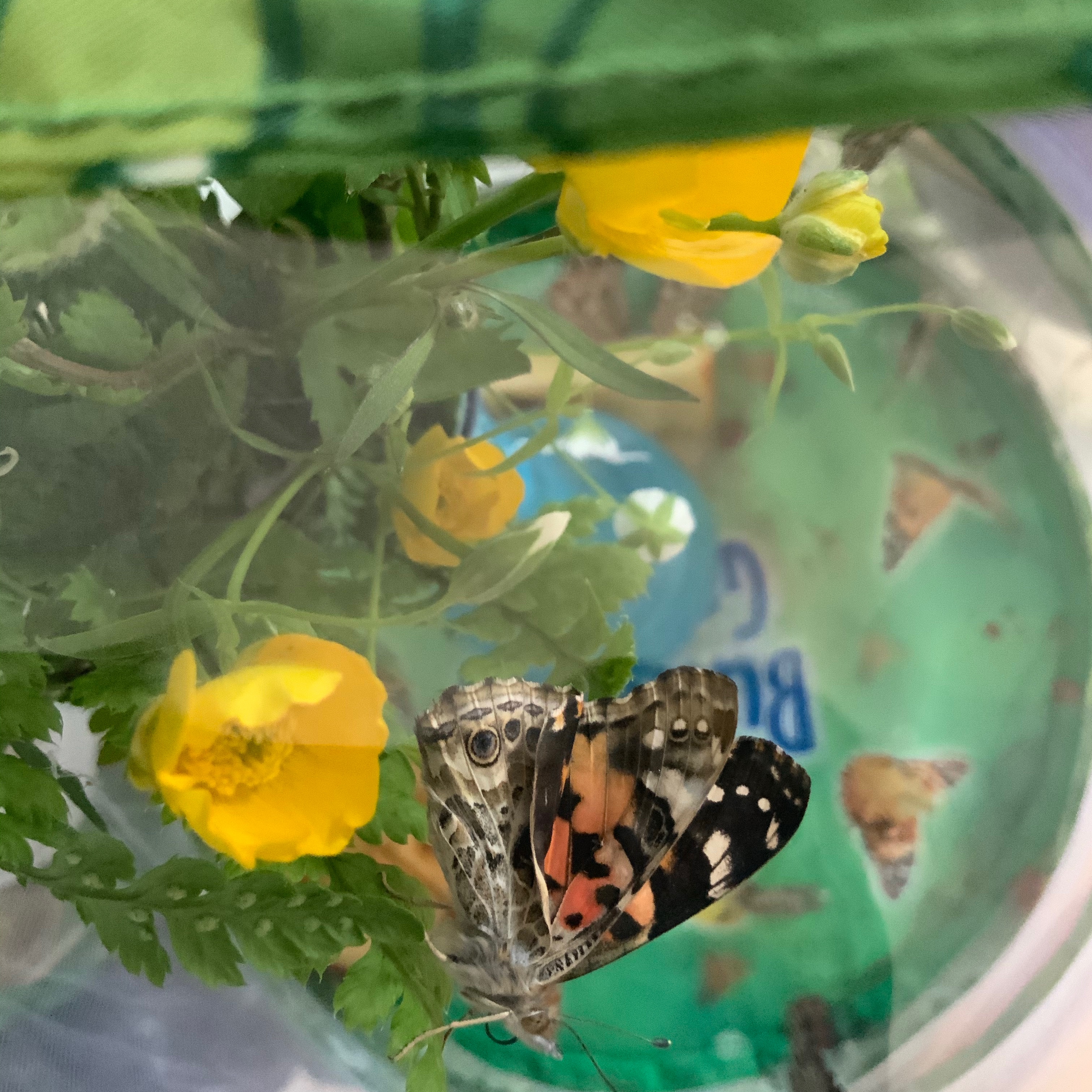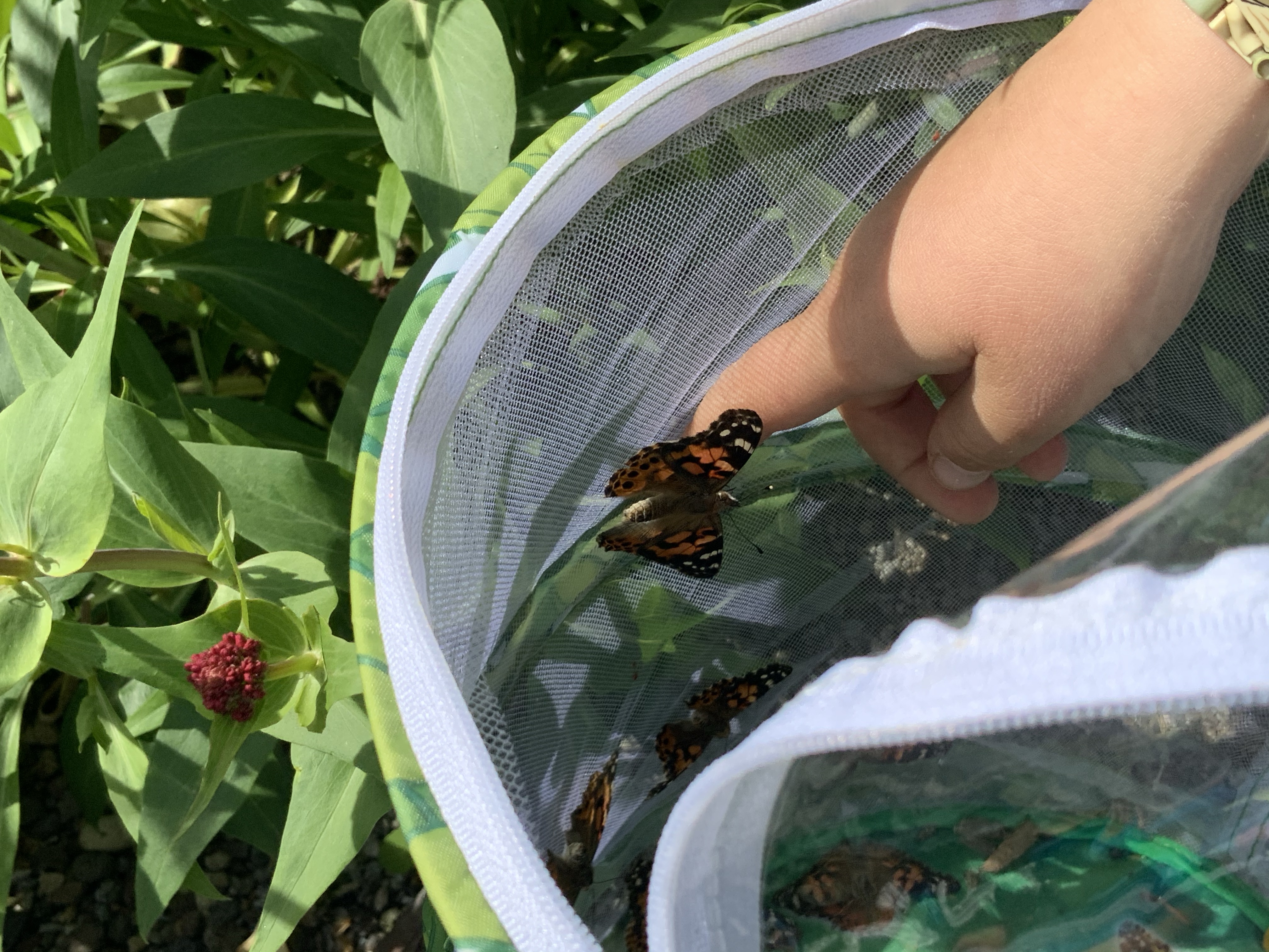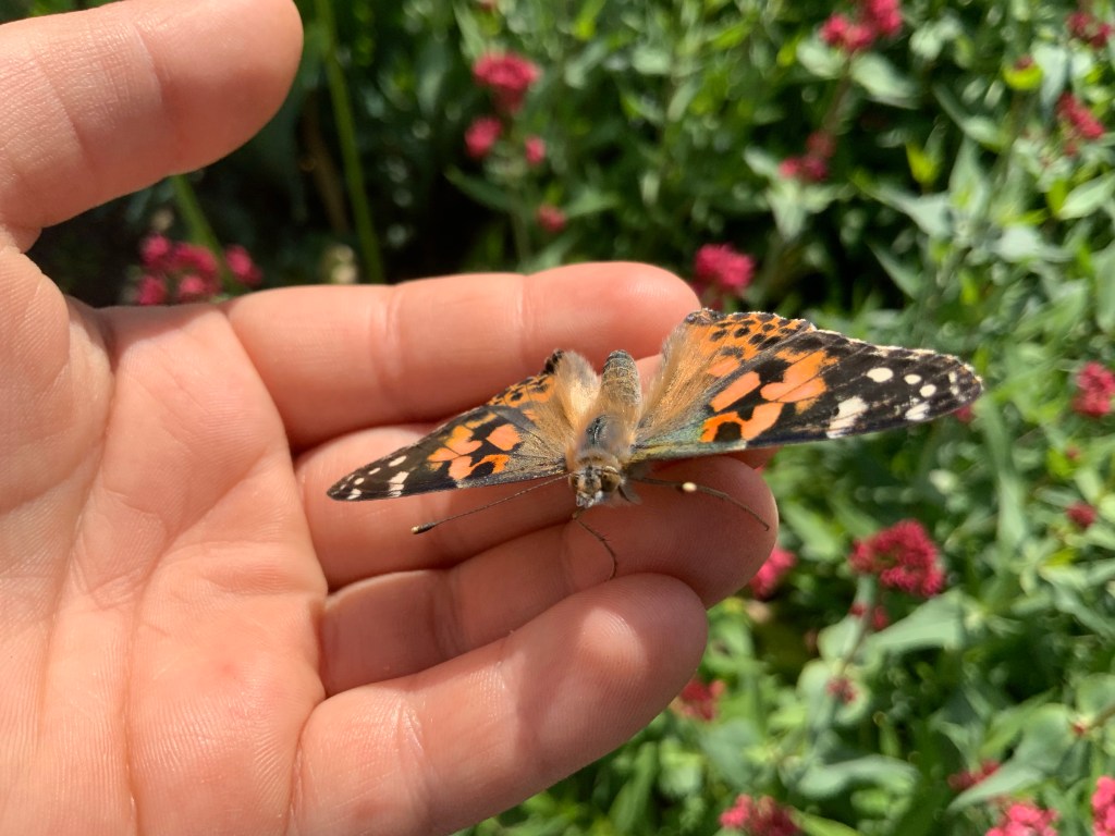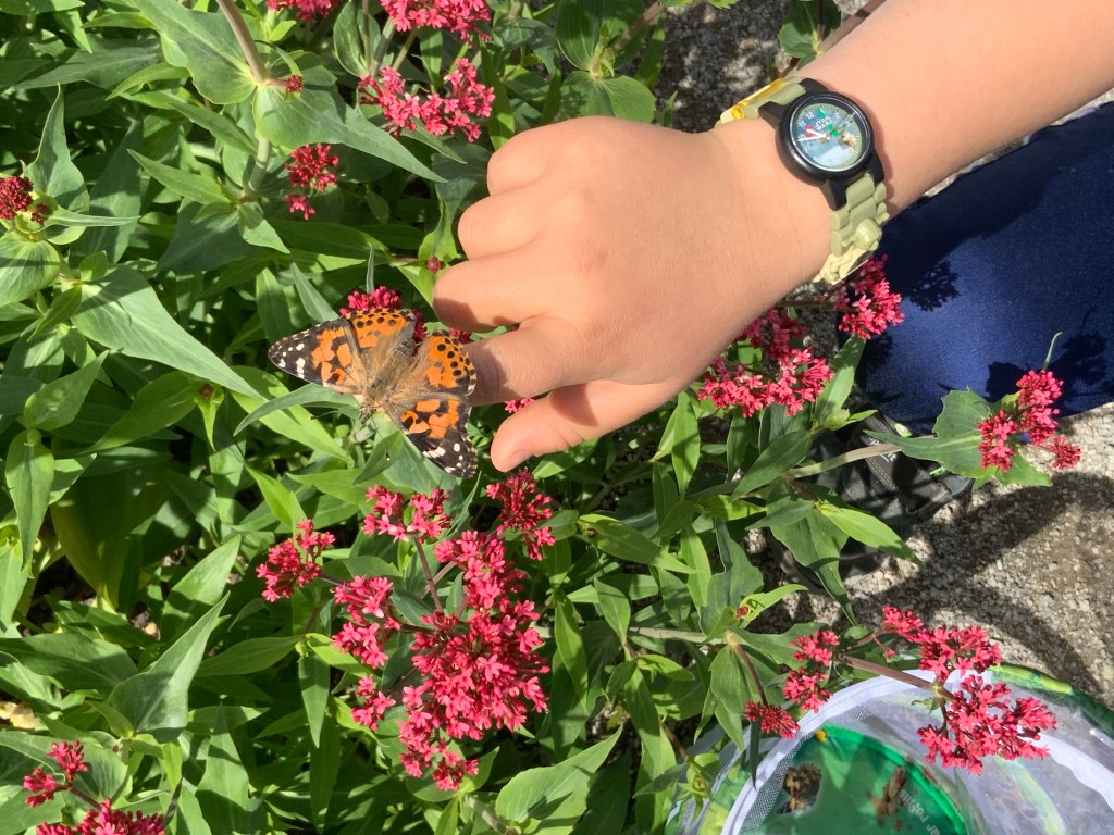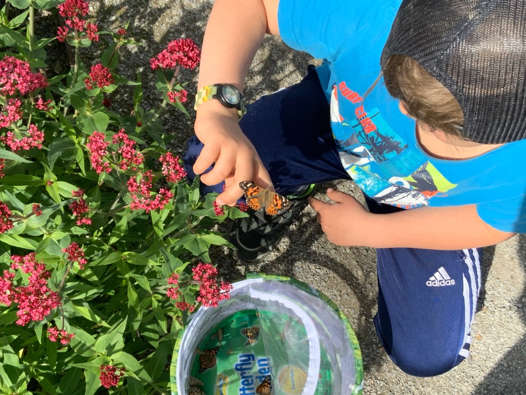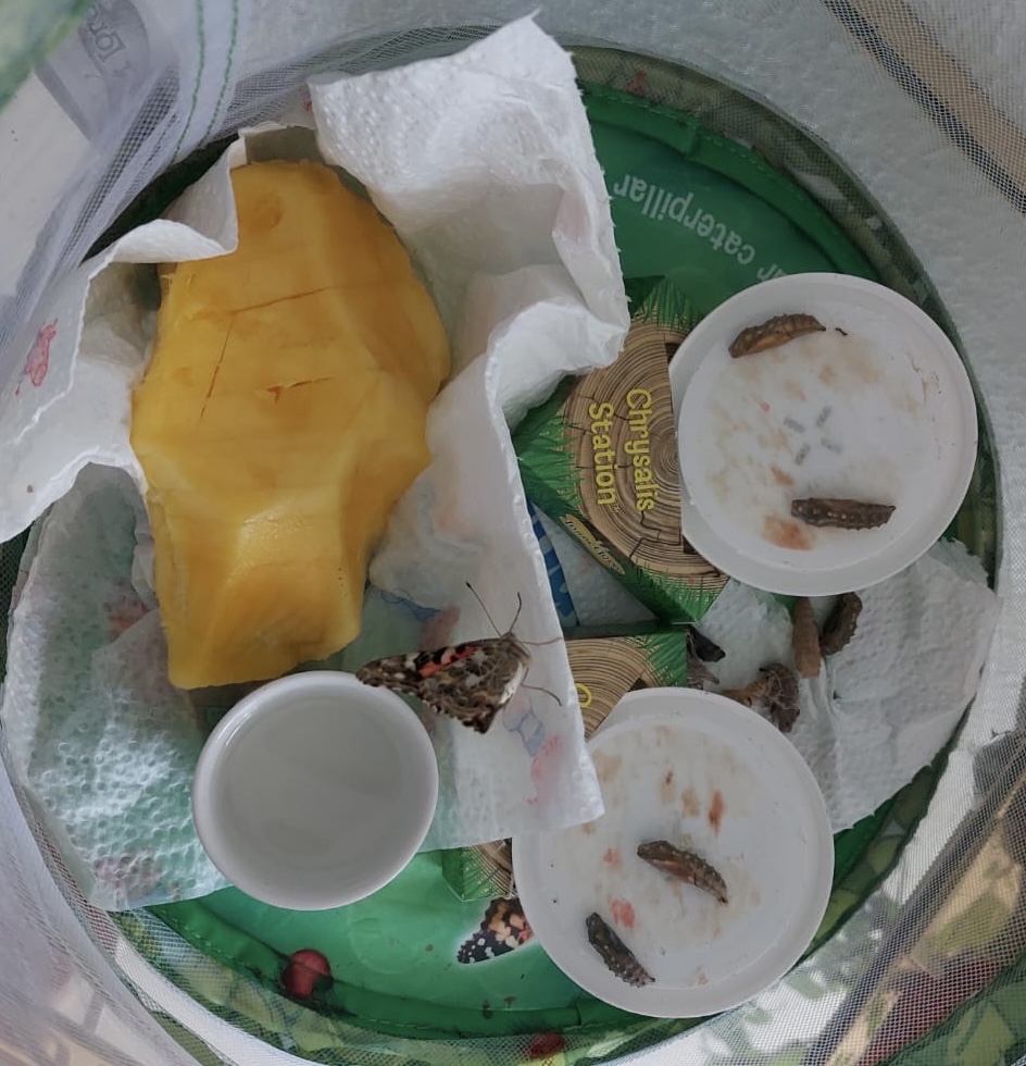 Endlich war es dann soweit: Eines Morgens war der erste Distelfalter aus der Raupe geschlüpft. Endlich konnte wir mit Füttern loslegen. Entweder selbstgemachtes Nektar (= mit Zucker vermischtes Wasser) oder Obststücke. Pepe versuchte es zwischenzeitlich auch mal mit Nutella-Brot, das kam aber erstaunlicherweise gar nicht so gut an. Neben der Metamophosen war dies der interessanteste Part. Namen wurden erneut vergeben. Die Beobachtung dieser faszinierenden Tiere war und ist sowohl für Kinder als auch für die Eltern spannend.