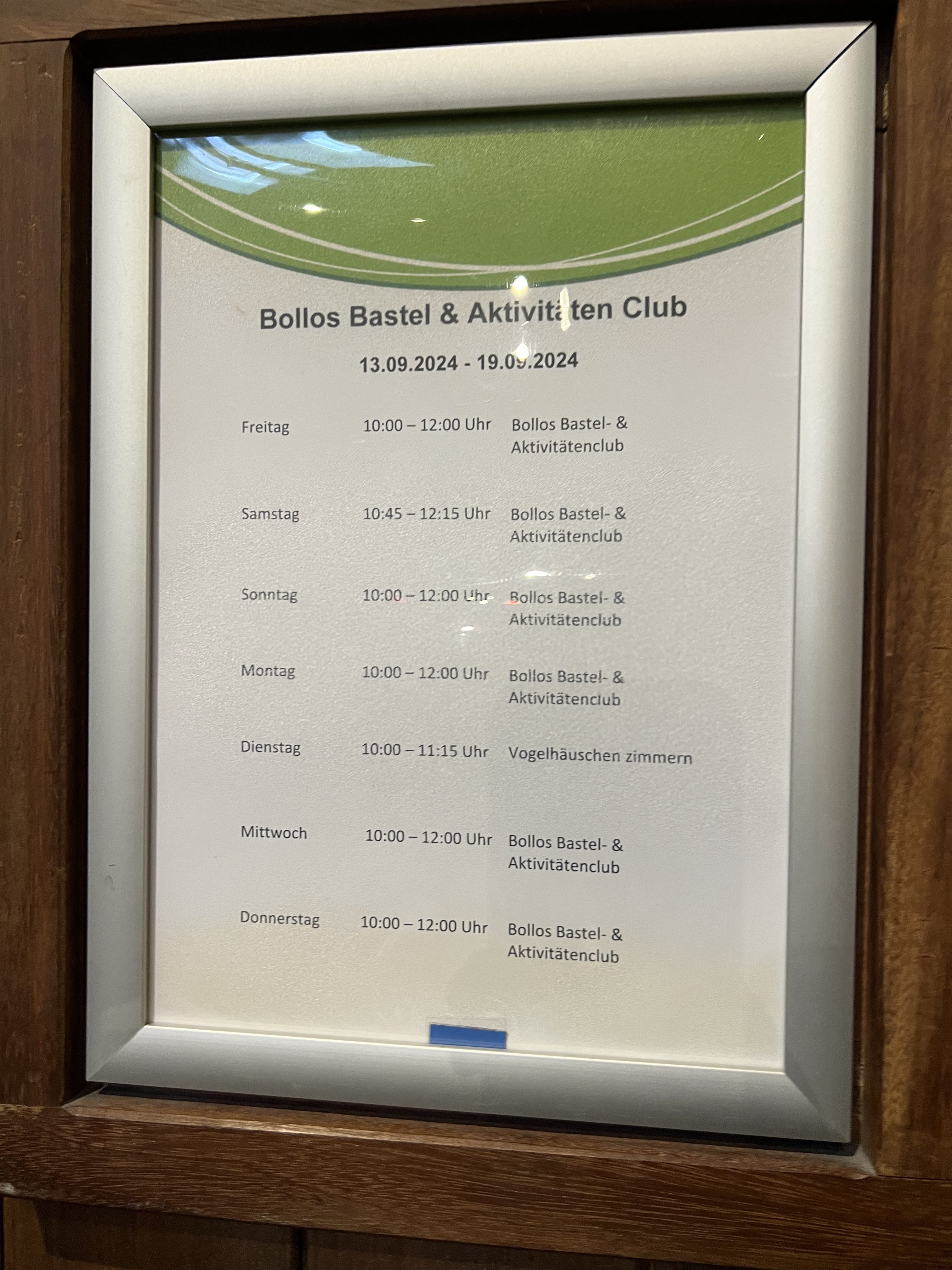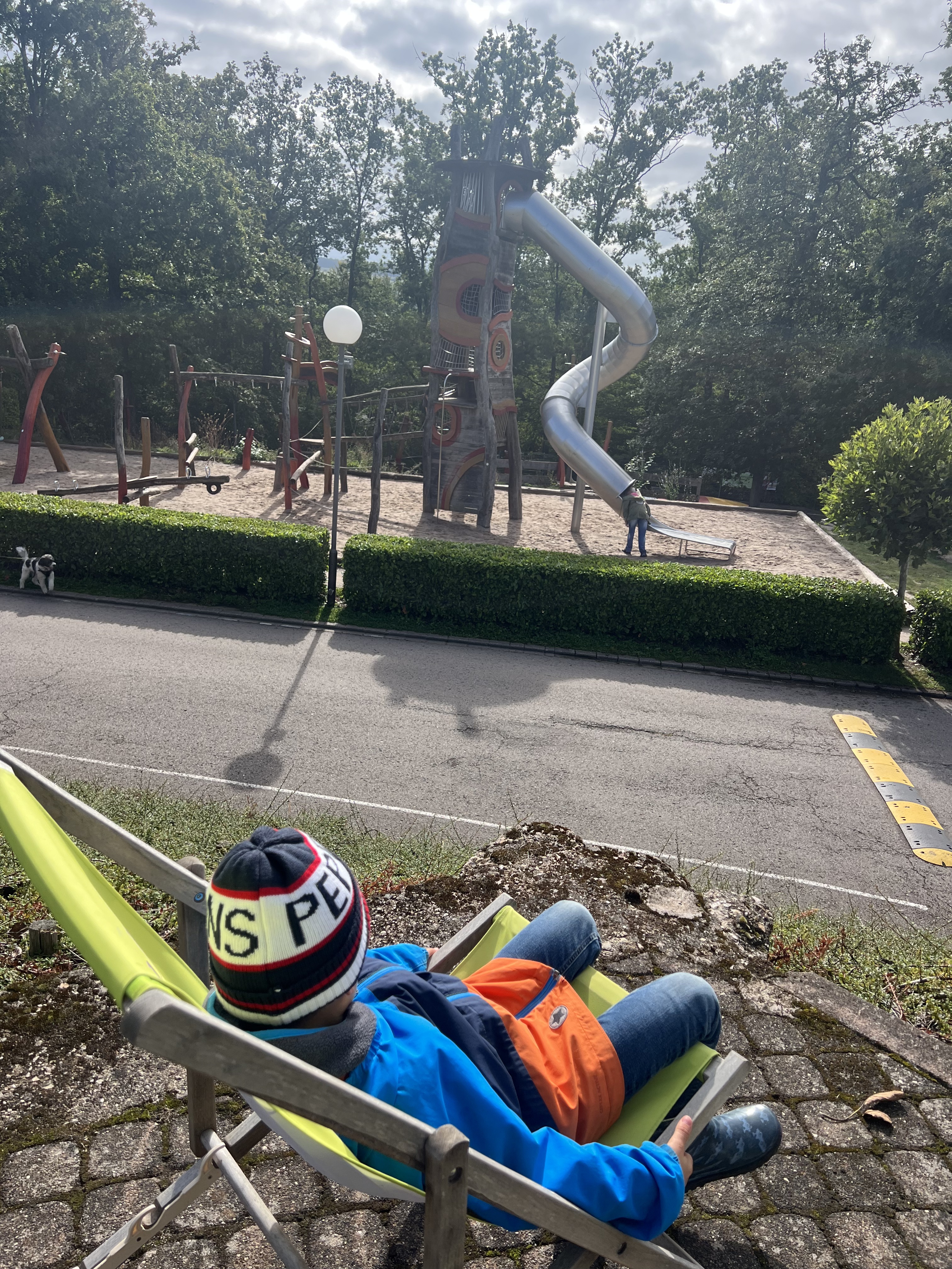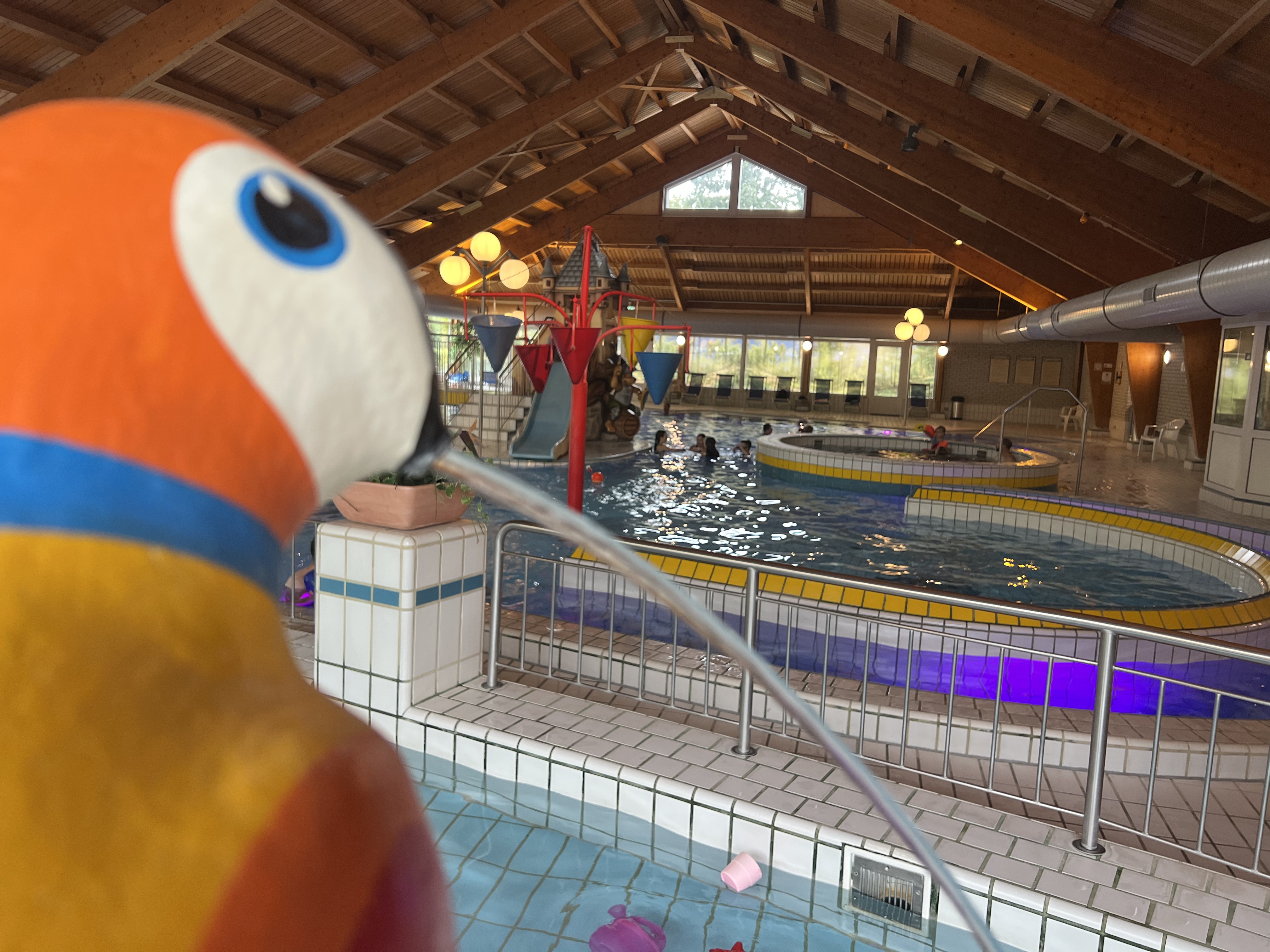 Der Sonntagsmorgen begann für uns wieder mit einer schönen heißen Guten-Morgen-Sauna und einem gemütlichen Frühstück. Könnte gerne mein neues Morgenritual werden! Davon aufgetankt machten wir uns auf ins Schwimmbad. Neben einem Babybecken gibt es hier ein buntes Kinderbecken mit Rutschinsel. Die Wassertemperatur ist angenehm. Für Wasserpausen stehen Liegen bereit. Essen ist hier nicht erwünscht – vom Beckenrand springen auch nicht, was wir dann erfahren haben 🙂