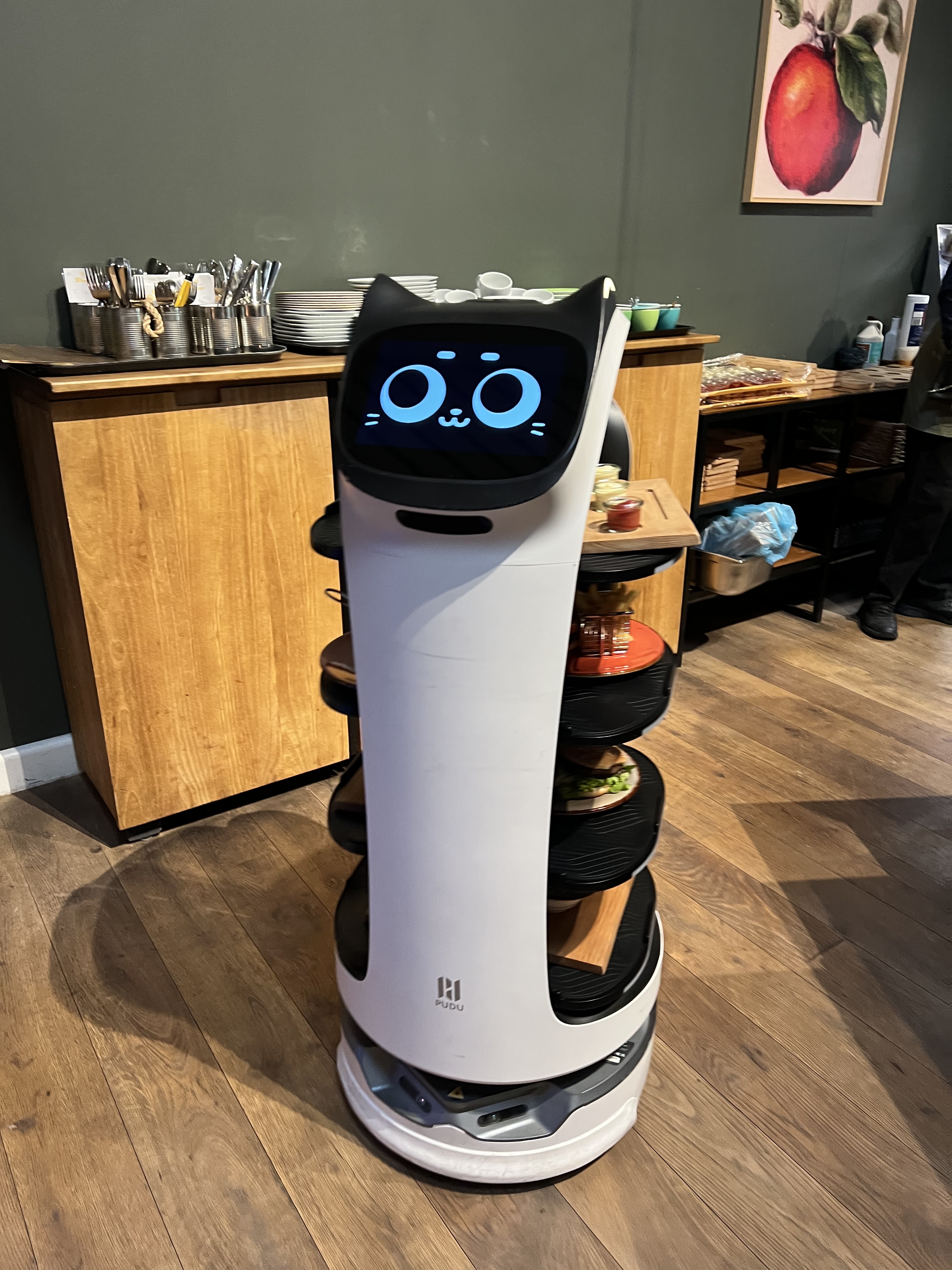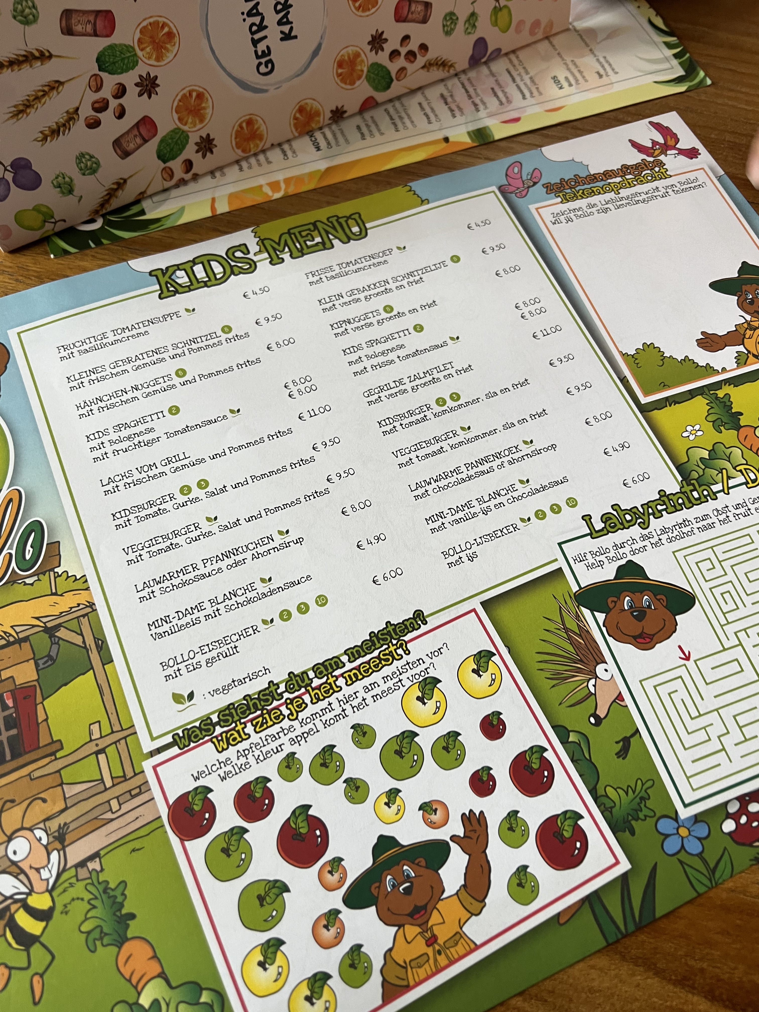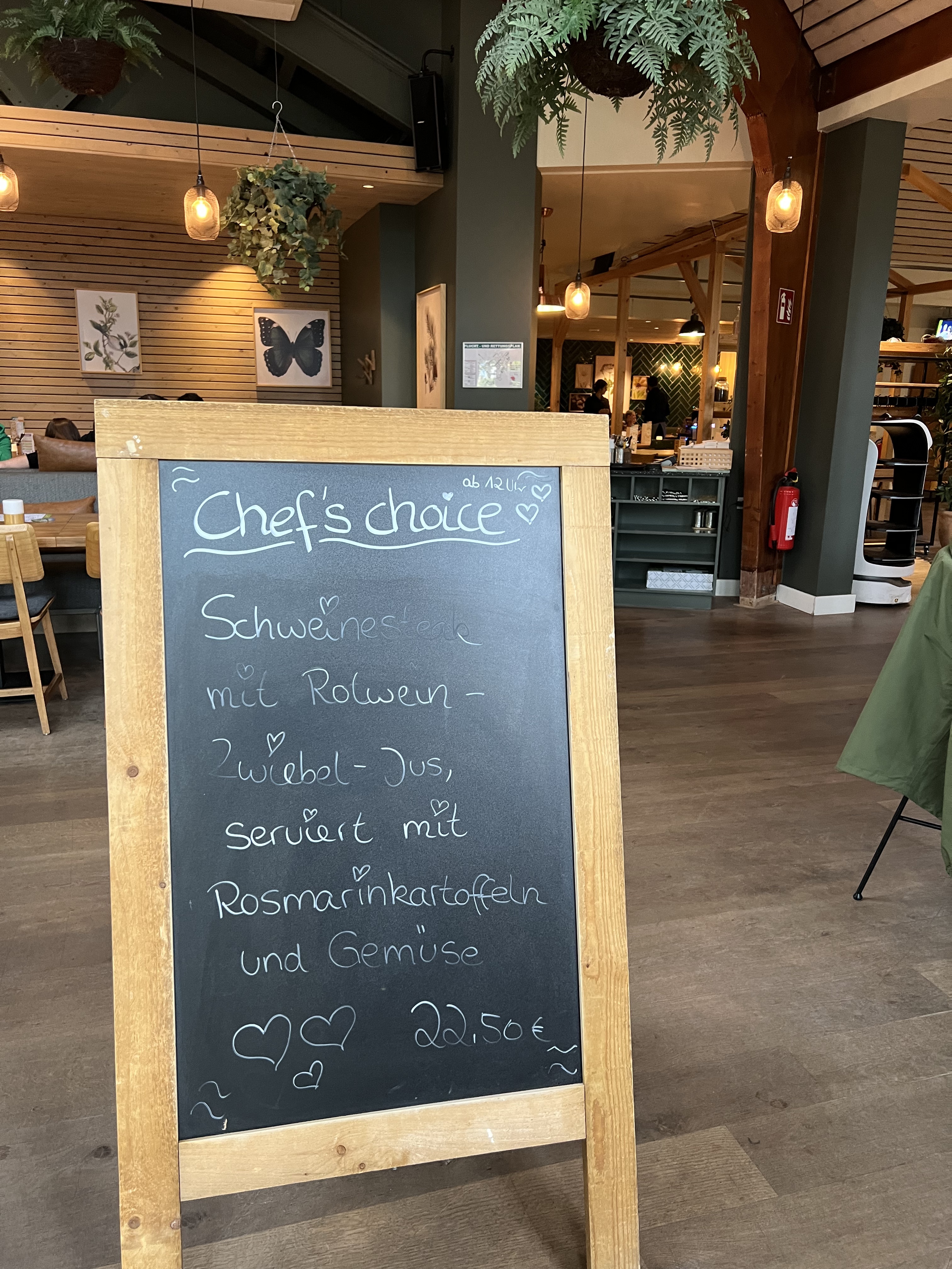 Mittags ging’s für uns nebenan ins Restaurant, das direkt mit dem Indoor-Spielplatz verbunden ist. So konnten die Kinder spielen gehen, während sie aufs Essen warten – super praktisch! An manchen Tischen darf man keine Hauptspeisen bestellen, da sollte man vorher drauf achten. Und darauf, dass man nicht in der Nähe der Tür sitzt, denn es gibt kein Windfang und so kommt mit jedem Gast auch ein (kalter) Windstoß rein. Der ganze Ferienpark Landal Sonnenberg ist digital bestens aufgestellt. Reisen 4.0, sozusagen. So dient das Handy beispielsweise als digitaler Schlüssel. Auch im Restaurant geht es fortschrittlich zu: Es gibt zwar eine papierhafte Speisekarte, aber man kann auch den QR Code, der auf dem Tisch ist, scannen und dann online bestellen. Das Essen ist ein bisschen teuer aber lecker. Zwei kleine Roboter helfen die Speisen zu bringen. Die Kids und ich fanden es witzig. Meinen Freundinnen war es ein wenig zu „abgespaced“. Manche mögen eben lieber die klassische Kellner Variante, die es hier aber auch gibt. Vor und nach dem Essen war wieder Spielen im Indoorspielplatz angesagt.