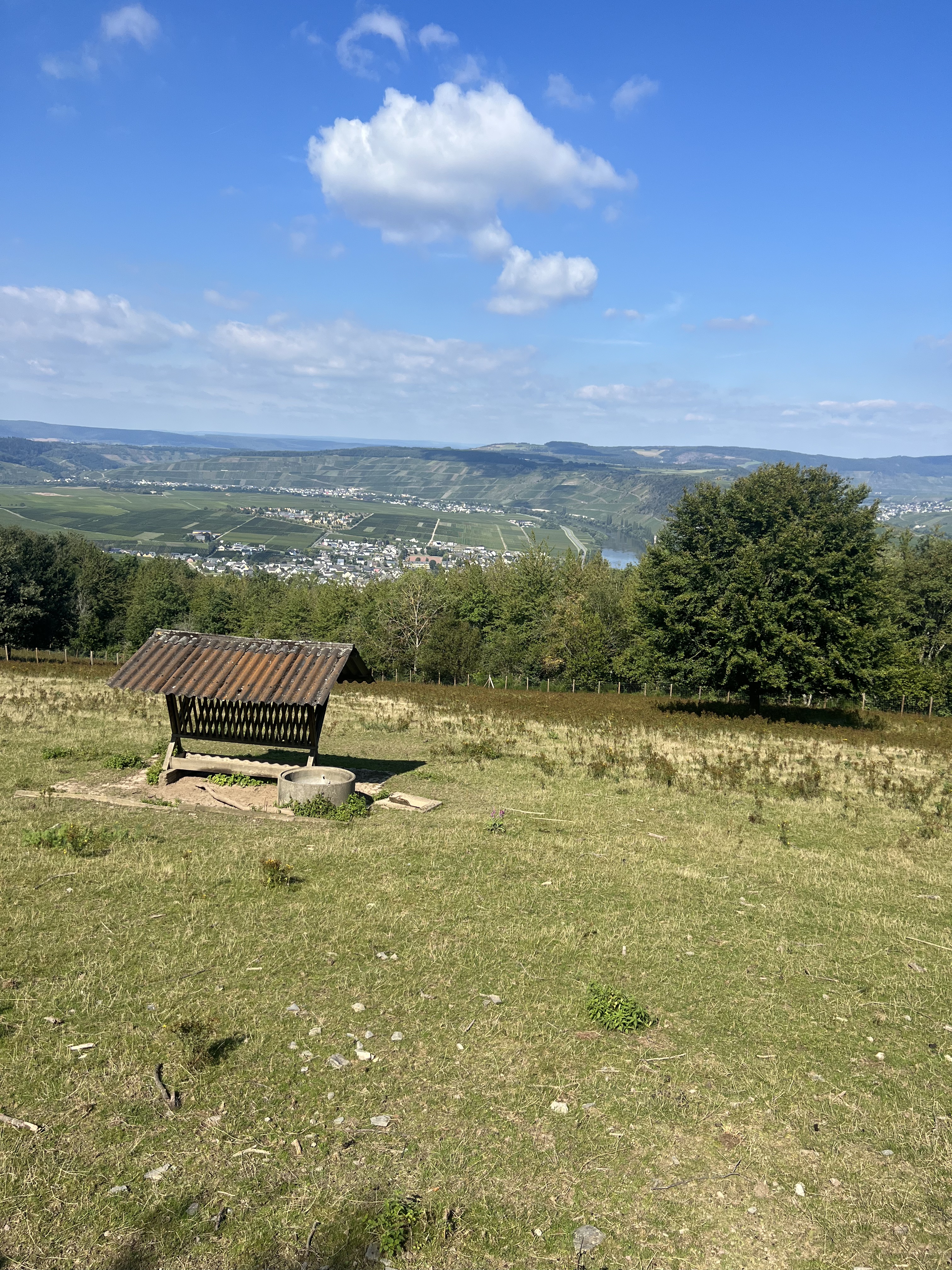 Die Aussicht bei der Anfahrt hatte uns richtig Lust gemacht, die Gegend rund um die Mosel näher zu erkunden. Also machten wir uns nachmittags auf zu einer kleinen Wanderung. Vorbei ging’s zunächst am parkeigenen Wildgehege. Das war nicht mehr ganz so einsam wie bei Sonnenaufgang. Dennoch herrlich, mit der Aussicht auf das Moseltal. Und Tiere füttern macht doch immer und allen Spaß, oder? Der Wegweiser zum „Moselkino“ machte uns neugierig. Nur 0,5 km entfernt, das könnten wir doch schaffen. … und wir entdeckten einen wunderschönen Aussichtspunkt! Als „Kinoleinwand“ dient hier ein riesiger Holzrahmen. Hauptdarsteller: die Mosel und das wunderschöne Moseltal. Gemütliche Bänke laden zum Entspannen ein. Für die Kids stehen Spielgeräte bereit. Ein Holzfass ist zur Selbstbedienungsbar für Moselwein umfunktioniert, bezahlen per Paypal möglich. Ne tolle Idee des Ortsvereines Leiwen! (Die kommt auch direkt mal in den Reiseführer :)) Und ein auf für (klein-)Kinder machbarer Wanderweg vom Ferienpark Landal Sonnenberg aus.